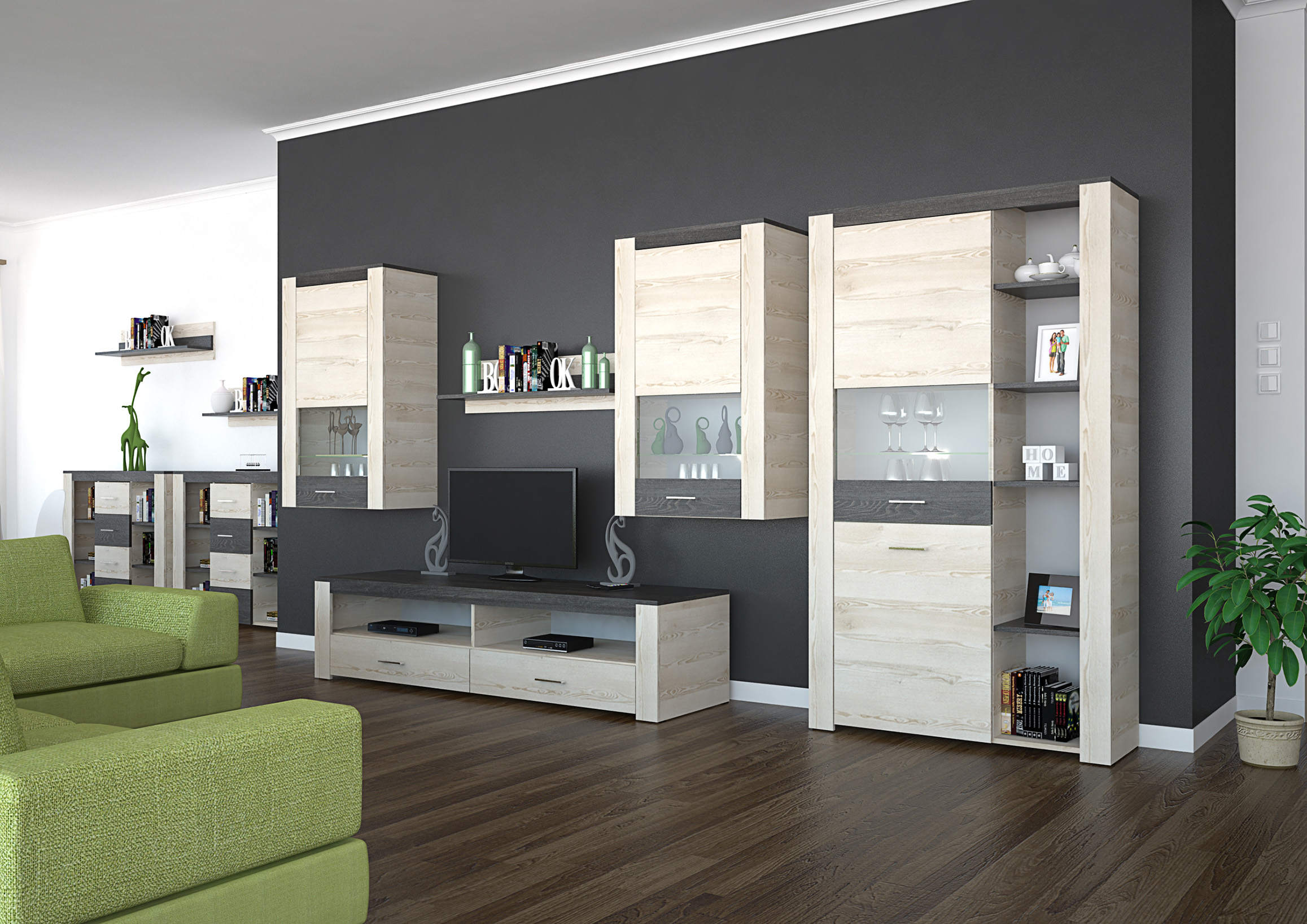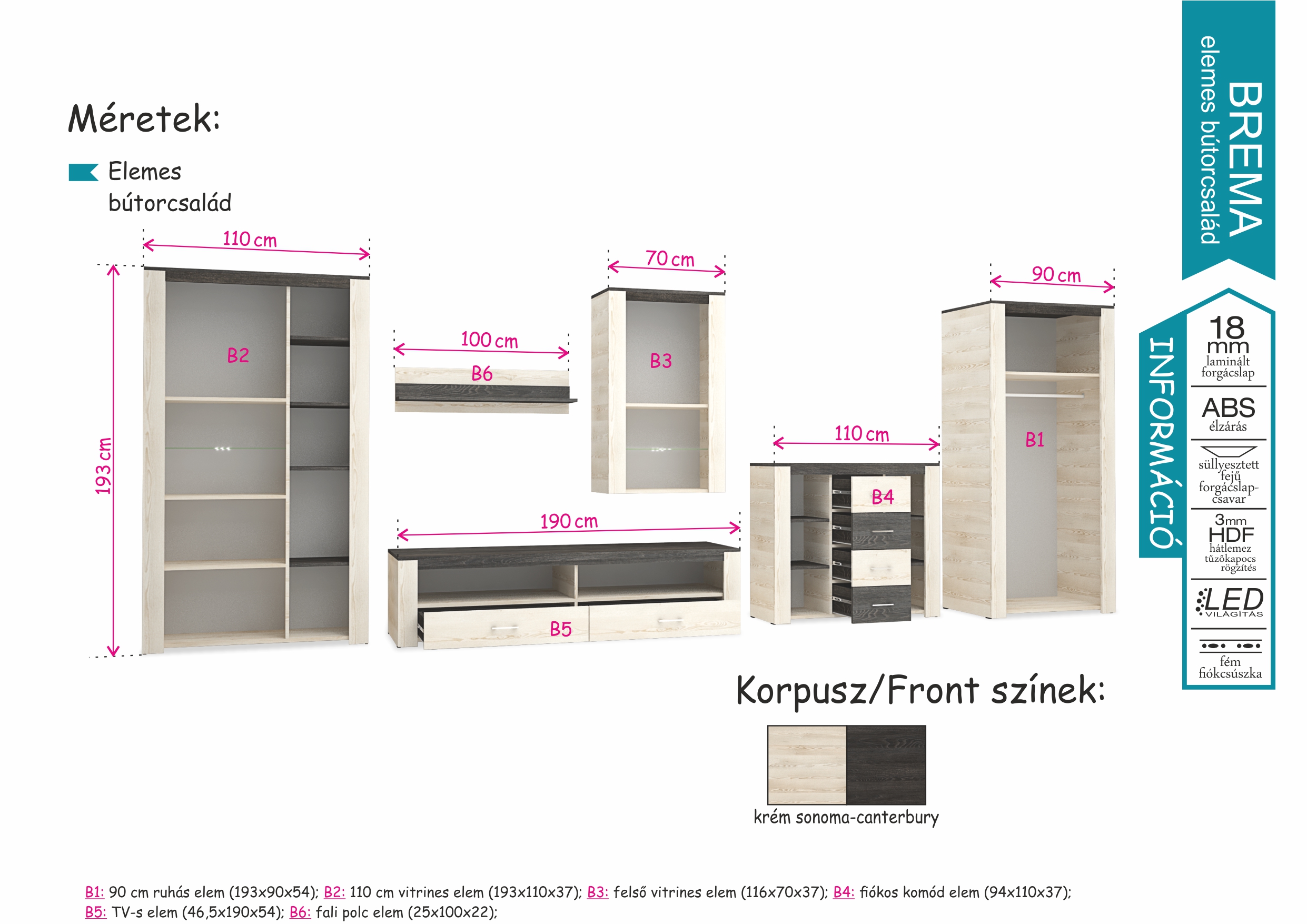 A Bréma elemes bútorcsalád variációs lehetőségeinek csak a fantázia szabhat határt. 6 különböző elemből lehet válogatni. Számos elképzelés könnyen megvalósítható, akár kisebb, akár nagyobb tér áll rendelkezésre. Krém sonoma és canterbury bútorlapos színkombinációjával, LED világításával kellemes megjelenést ad a lakás szinte bármely helyiségében. Az elemek több funkcióval is felruházhatók, így akár az egész lakás egységes stílusba öltöztethető, teljes harmóniát alkotva.